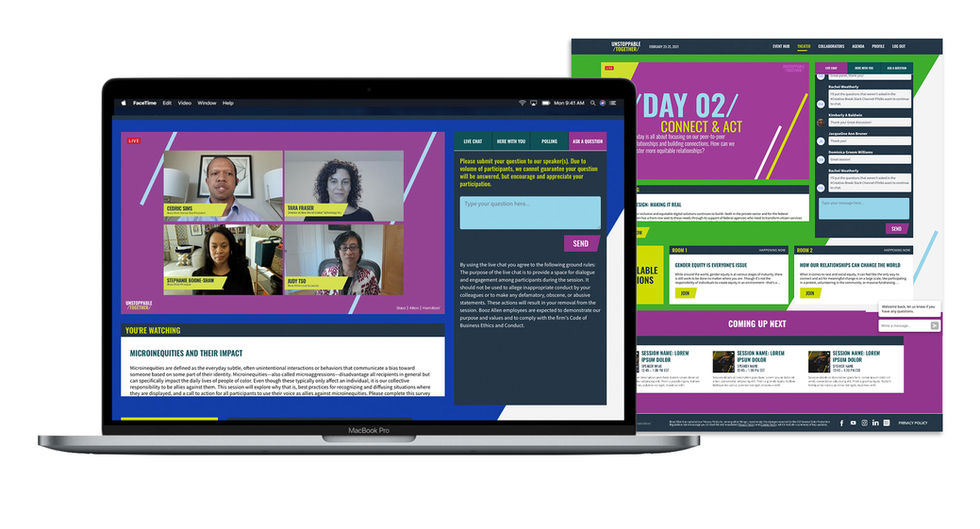 BAH is a leading employer in the Diversity, Inclusion & Belonging space, having won consistent accolades for their DI&B efforts over the years. Every year the Unstoppable Together summit focuses on one of their DI&B sectors. In the wake of Covid-19 shifting this event to a strictly virtual experience, BAH had a chance, for the first time, to invite their global internal audience as well as select clients. We created a custom live event platform geared towards community engagement and conversation surrounding tough topics of this years theme, Racial Injustice & Social Equity. The platform integrated a variety of networking and connection options, resources hub, and on-demand library for show content. We created an expansive branding and social media package as it launched the new evergreen brand campaign. The end product was a highly successful virtual event filled with incredible speakers from all over the globe delivering rich, moving conversation and inspiring stories. The audience and, furthermore, the client, was blown away by the impact of the final product.